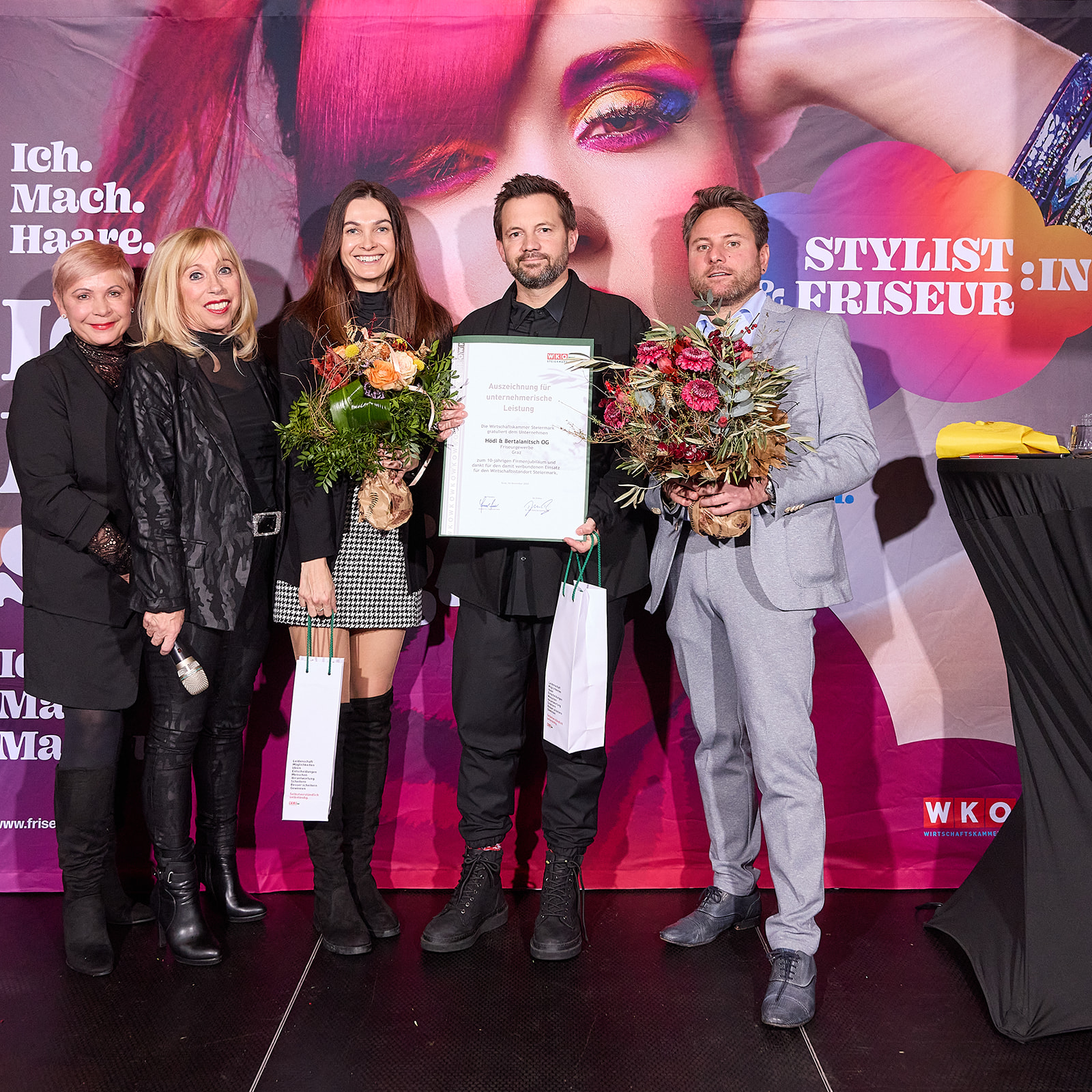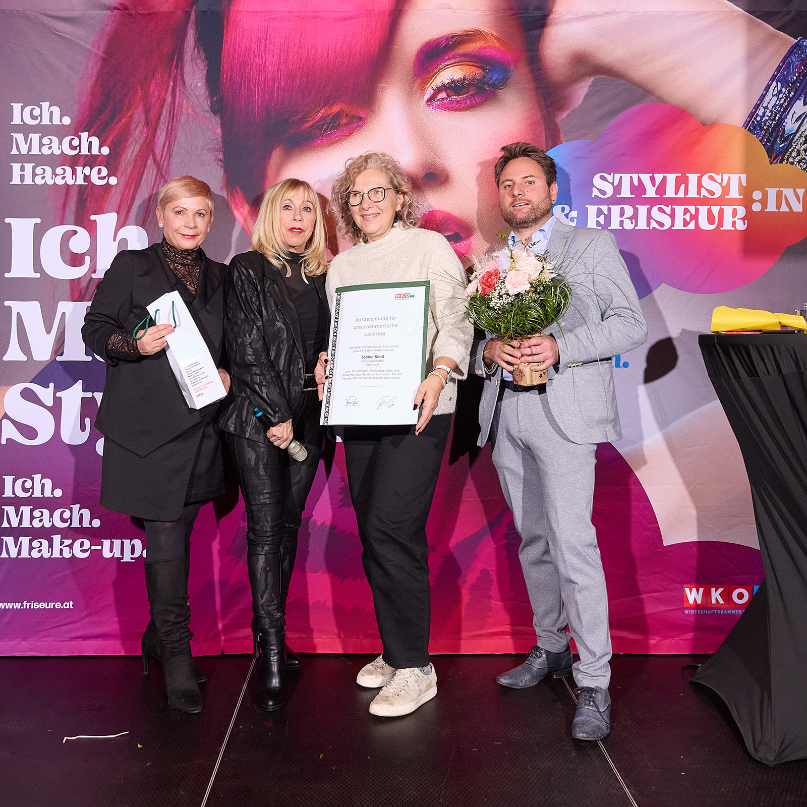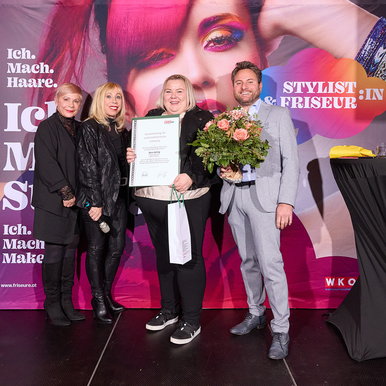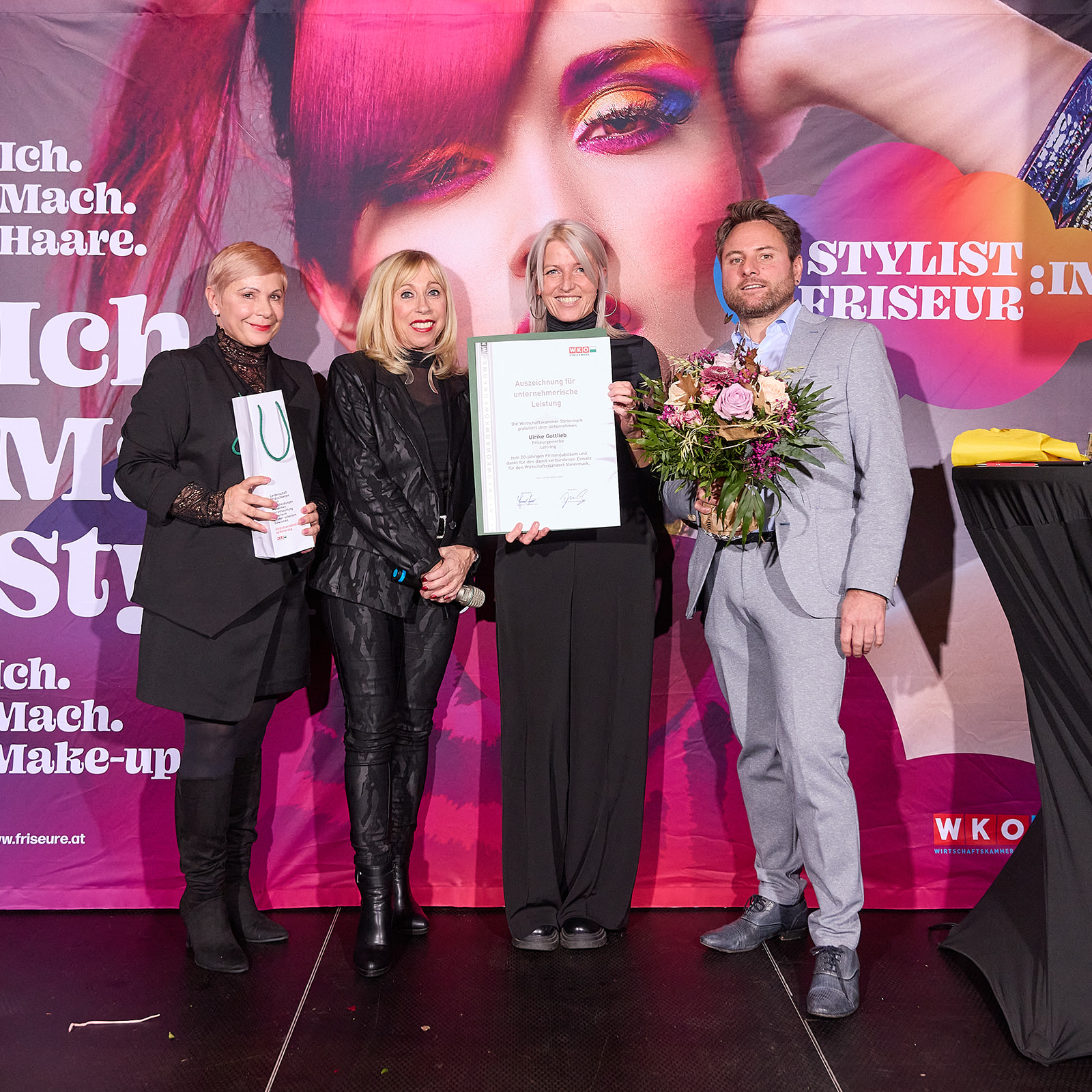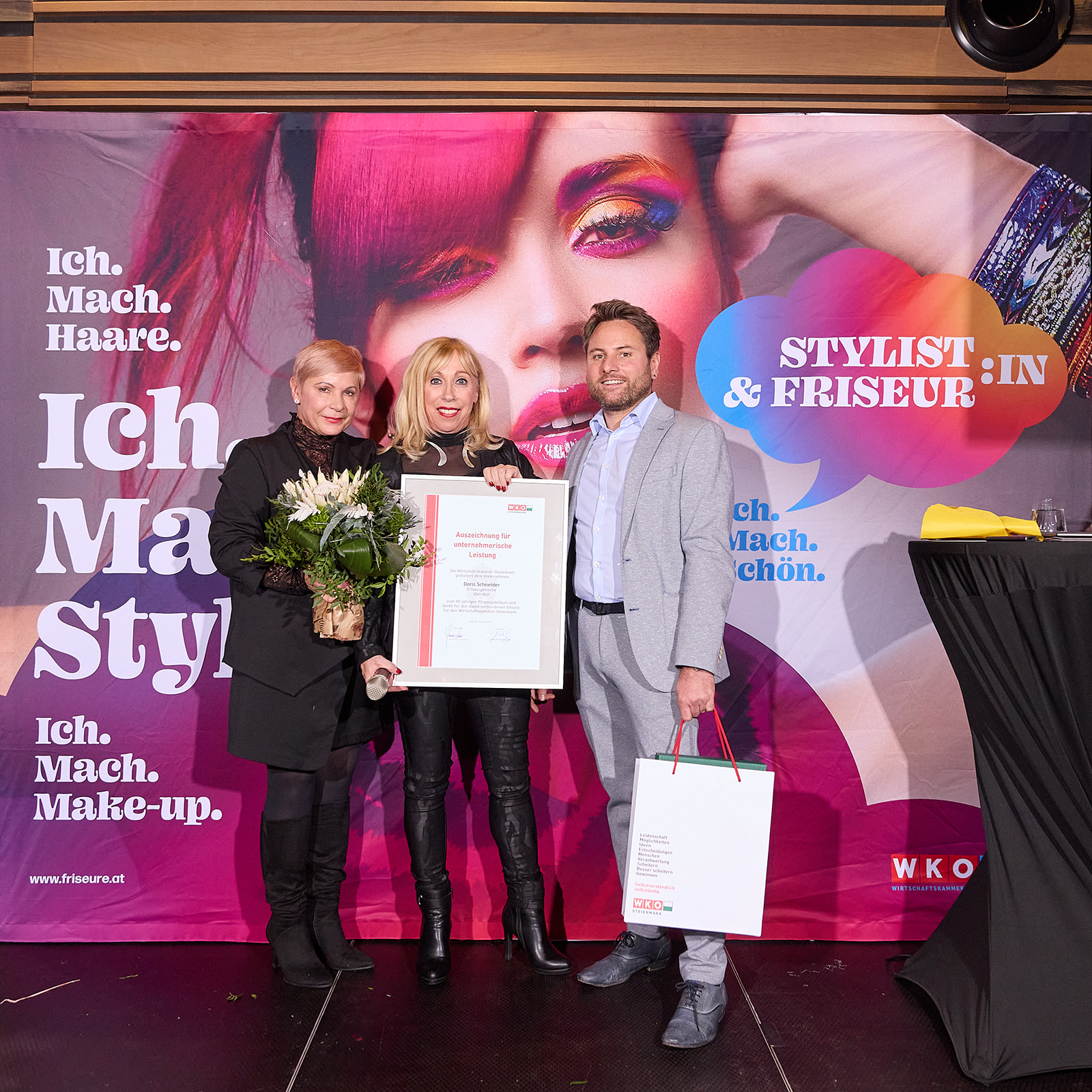 Für Landesinnungsmeisterin Mst.in Doris Schneider wurde der Abend zu einem ganz besonderen Moment: Sie leitete nicht nur die Feierlichkeiten, sondern erhielt selbst die Auszeichnung für ihr bemerkenswertes 40-jähriges Unternehmerinnenjubiläum. Ihre Stellvertreter:innen Mst.in Sabine Meister und Mst. Erwin Müllner würdigten sie mit großer Wertschätzung und nahmen gemeinsam mit den vielen Gästen Anteil an diesem Meilenstein.
