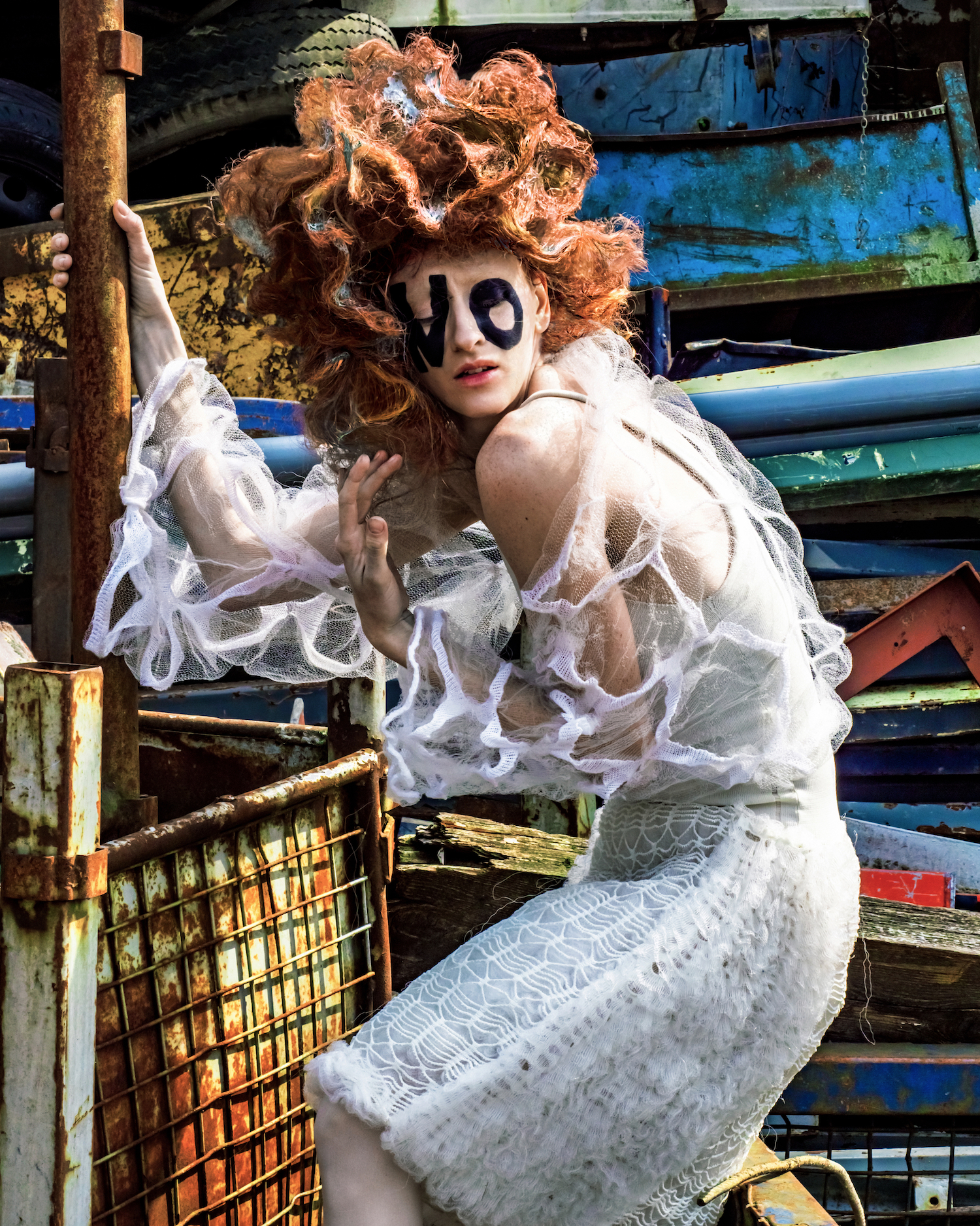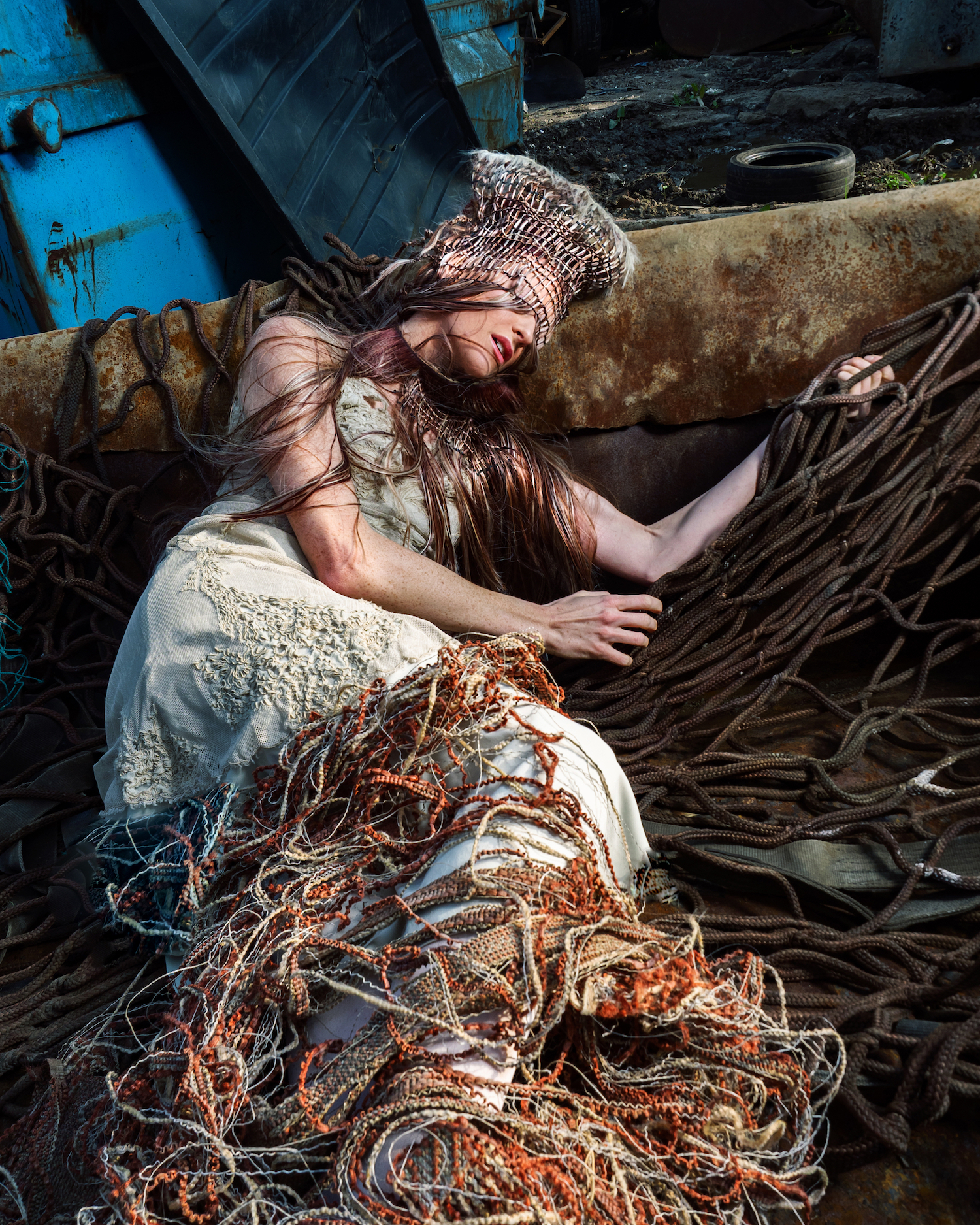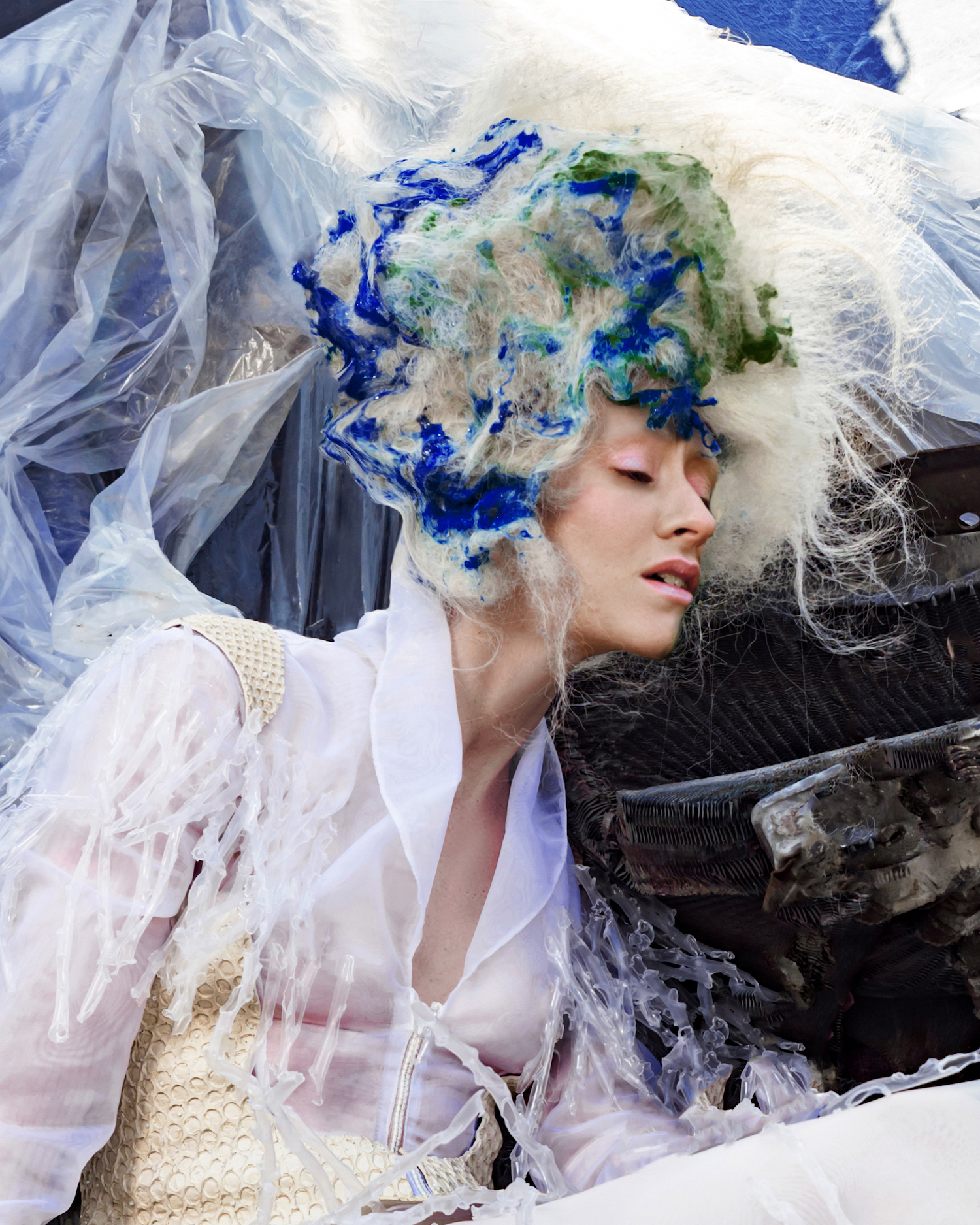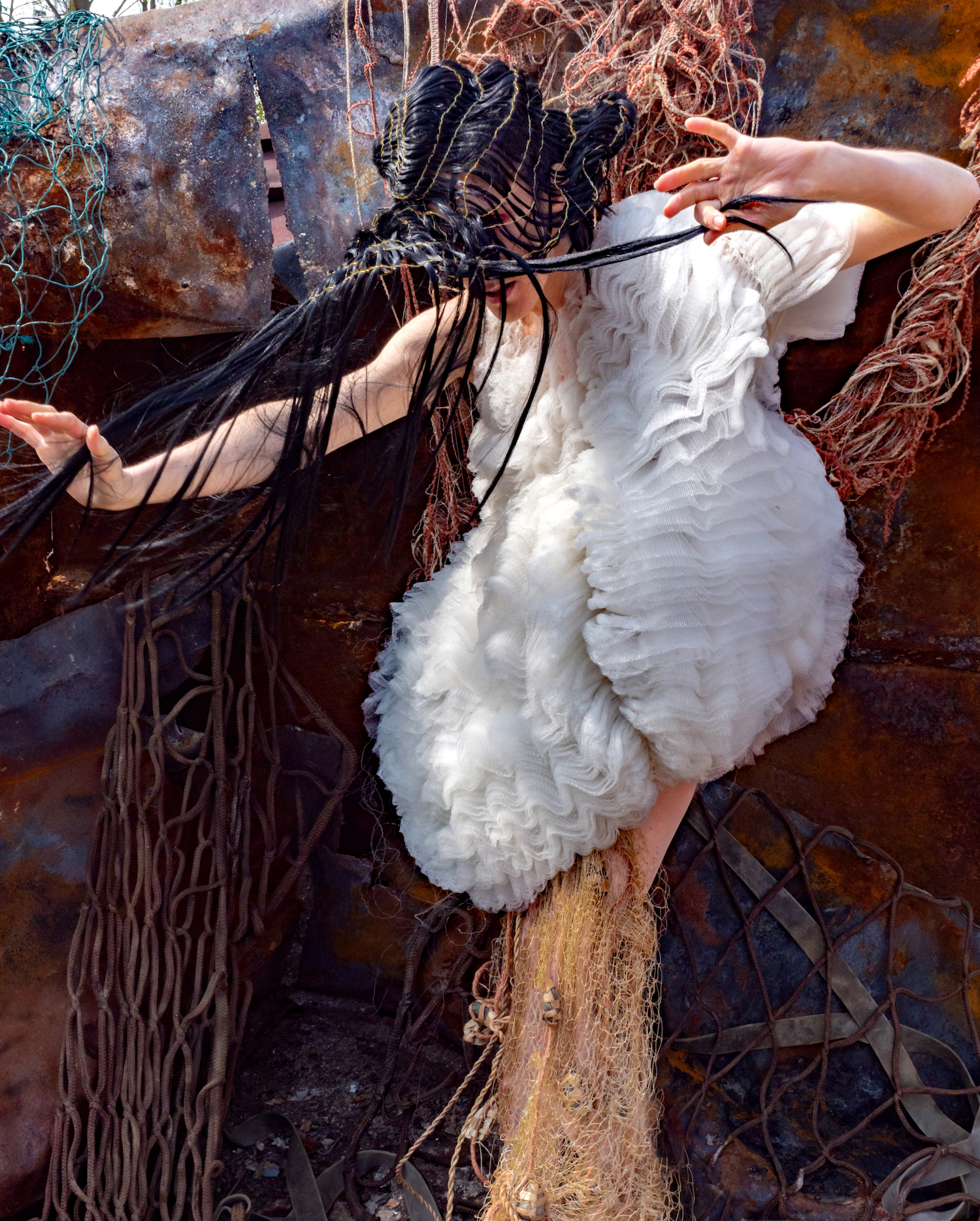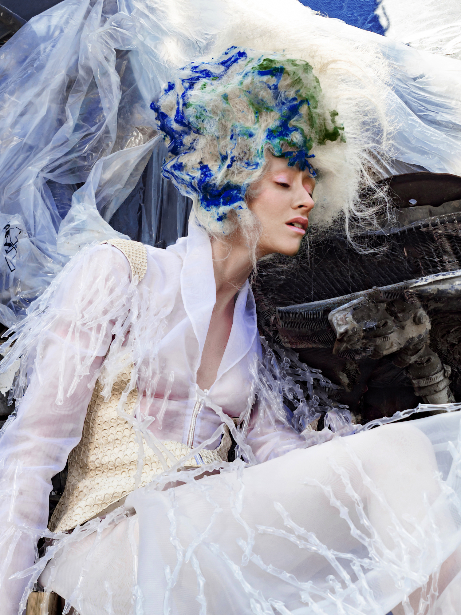 Aufgenommen auf einem Schrottplatz, verdeutlicht jedes Bild die ökologischen Auswirkungen zentraler Industrien – Textilien, Mode und Hair – und deren übermäßigen Einsatz von Plastik, Deponieabfällen und umweltbelastenden Materialien. Gleichzeitig nutzt sie die Arbeit, um auch auf die Folgen nicht nachhaltiger Lebensmittelproduktion und Fischerei aufmerksam zu machen.