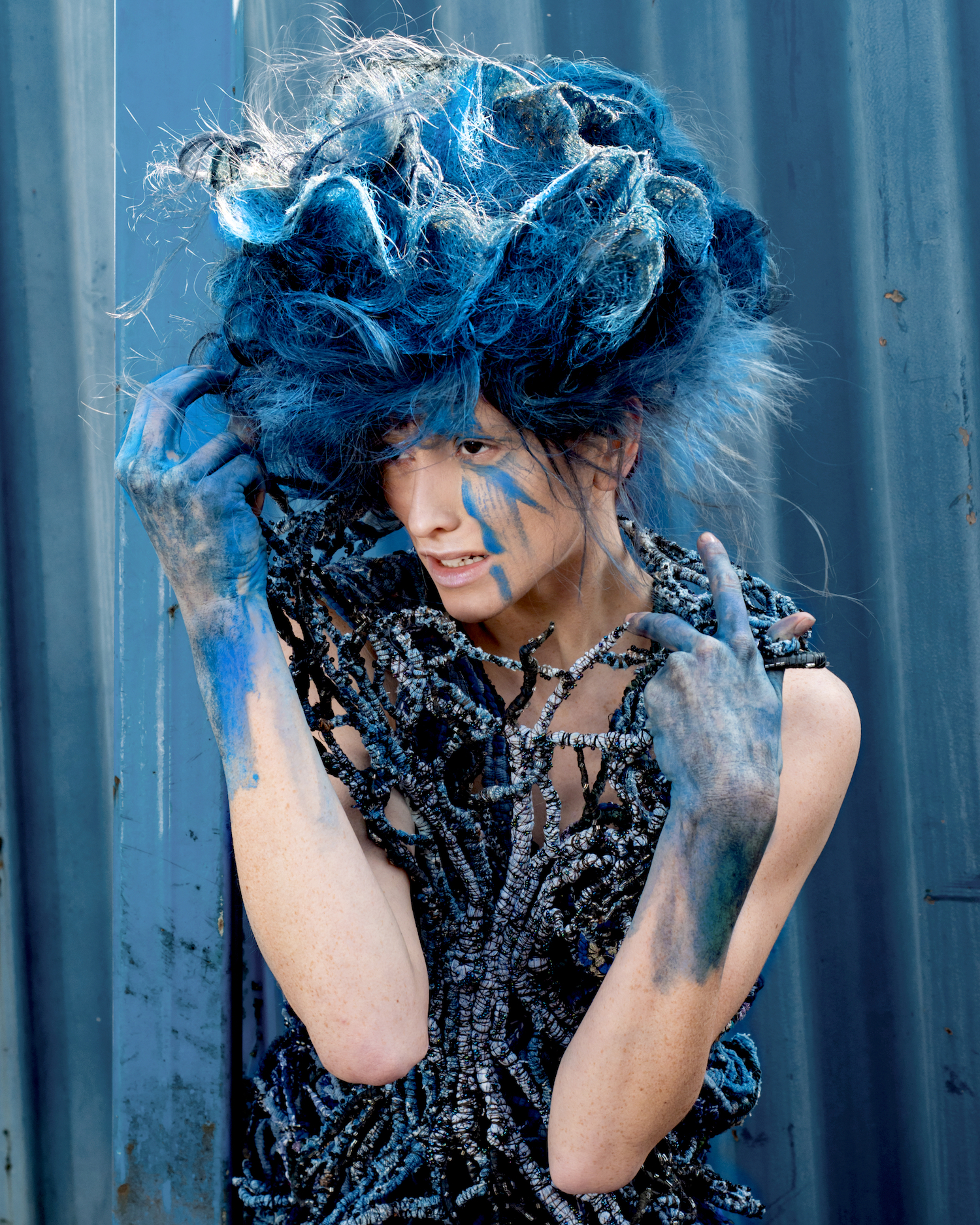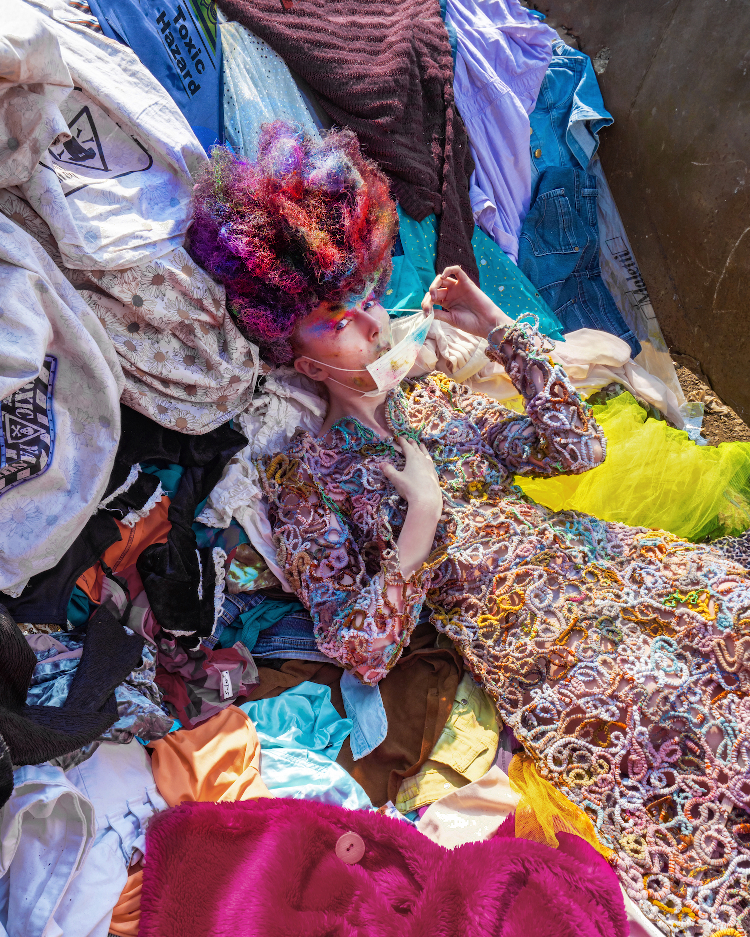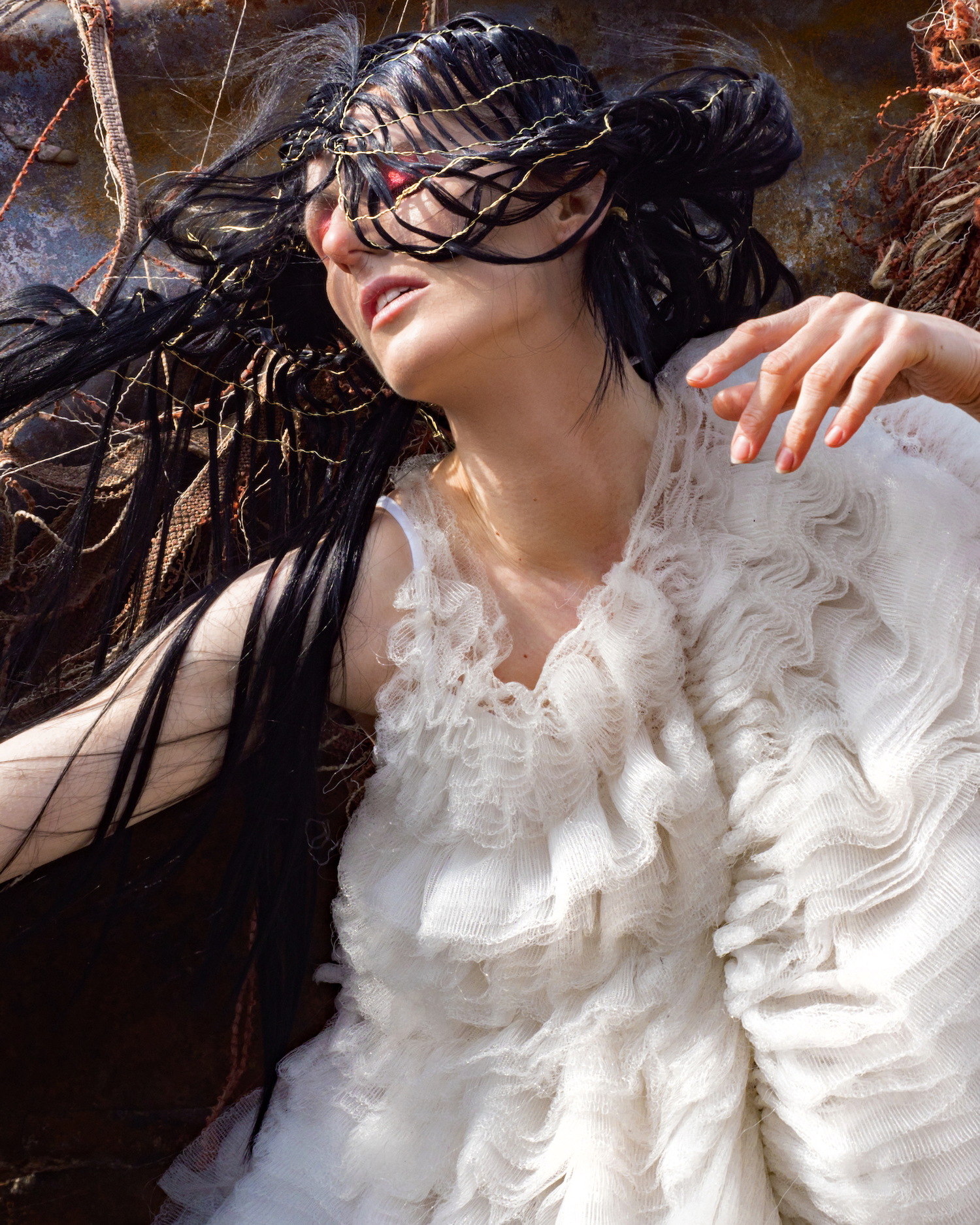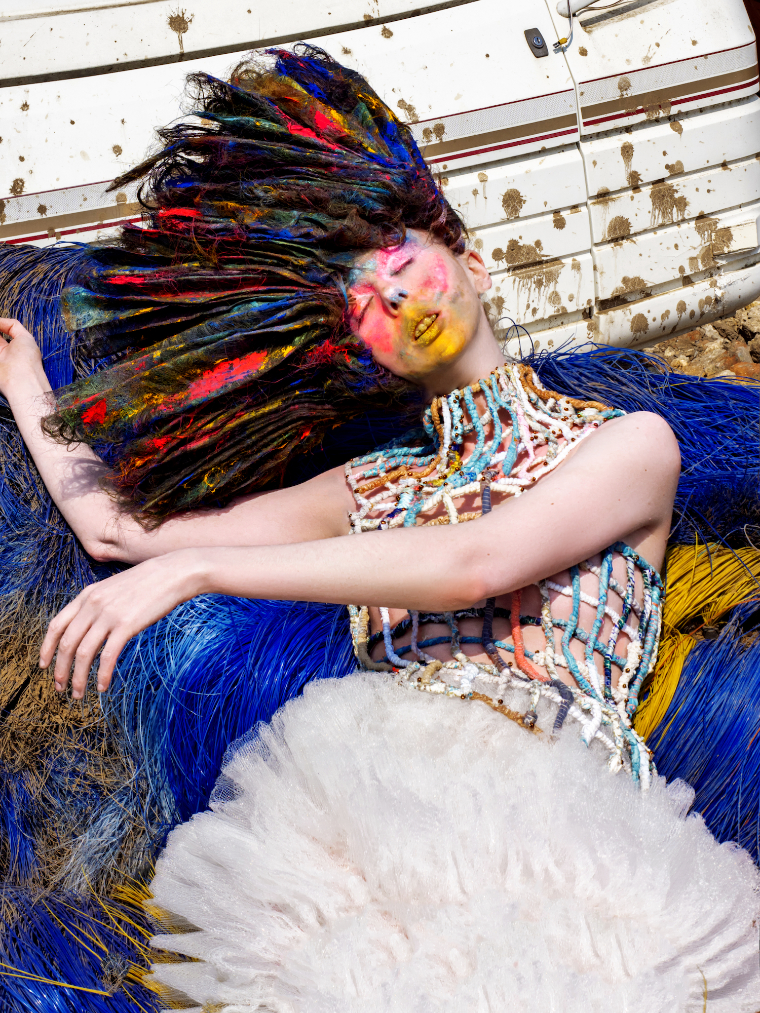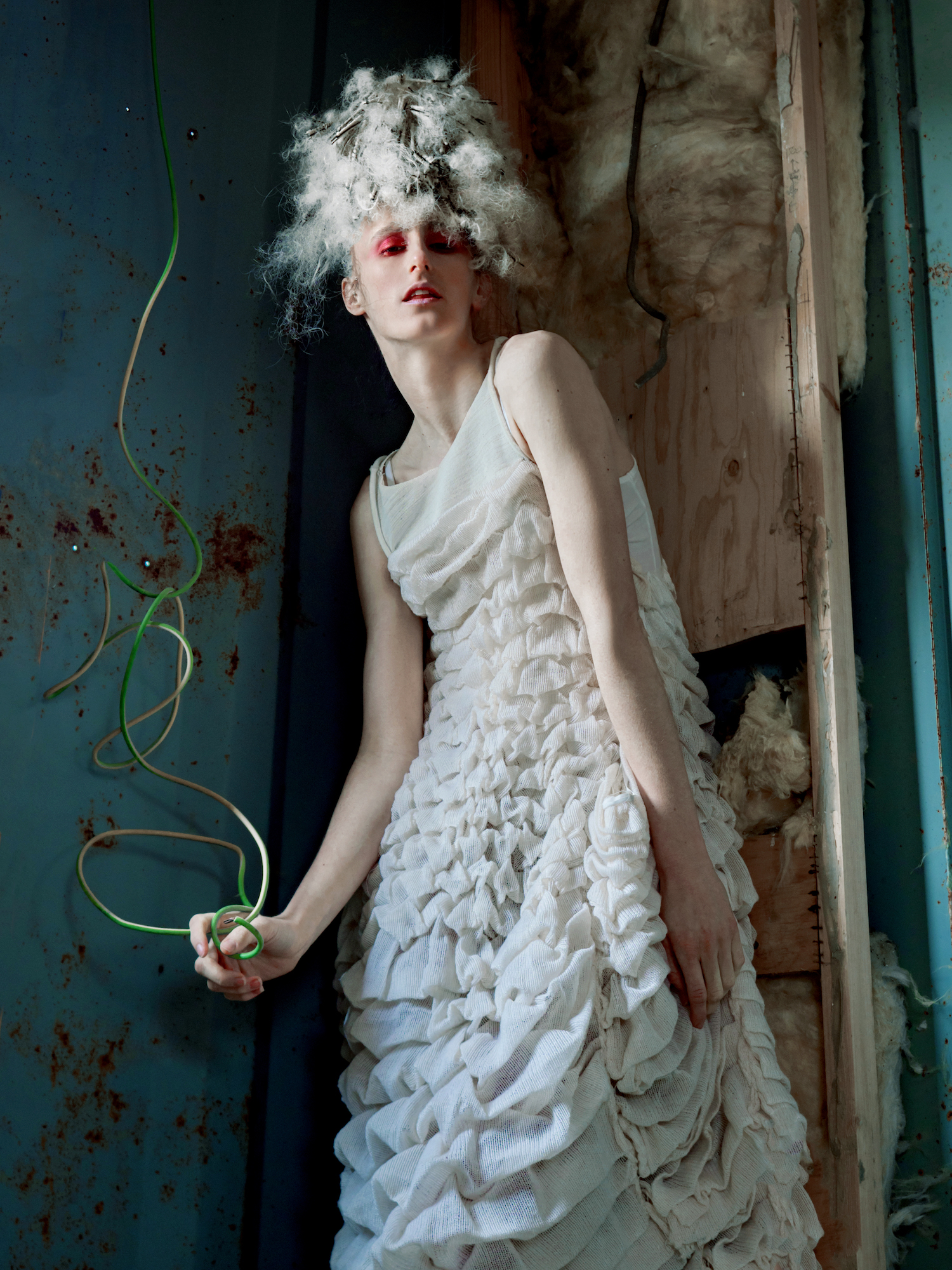Aufgenommen auf einem Schrottplatz, verdeutlicht jedes Bild die ökologischen Auswirkungen zentraler Industrien – Textilien, Mode und Hair – und deren übermäßigen Einsatz von Plastik, Deponieabfällen und umweltbelastenden Materialien. Gleichzeitig nutzt sie die Arbeit, um auch auf die Folgen nicht nachhaltiger Lebensmittelproduktion und Fischerei aufmerksam zu machen.