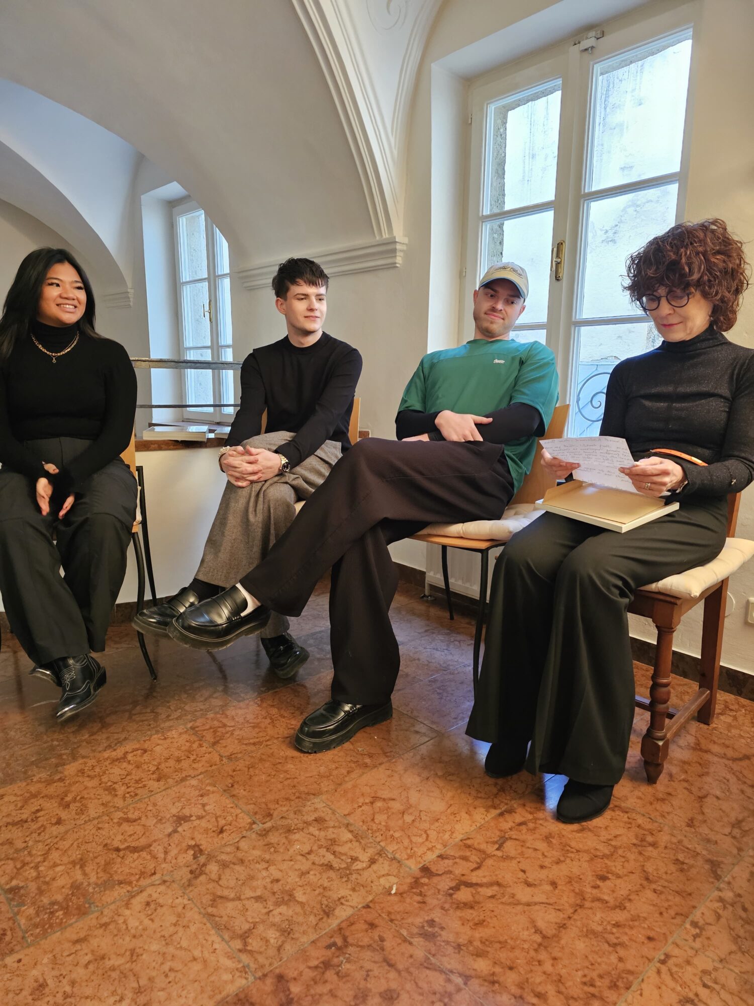 Am dritten Seminartag – dem Abschluss des ersten Ausbildungsabschnitts – überraschten die vier Award-Gewinner:innen Waltraud McLean mit Blumen, einem gerahmten Erinnerungsfoto sowie einem persönlichen, sehr wertschätzenden Brief. Die Teilnehmer:innen bedankten sich ihrerseits herzlich für das außergewöhnliche Gesamterlebnis dieses ersten Schrittes ihrer Fortbildungsreise, die Ende März mit dem zweiten Seminar-Step fortgesetzt wird.