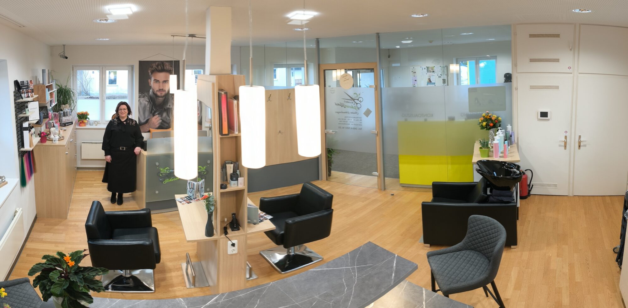 Auch das Einrichtungskonzept folgt diesem Gedanken: Eine integrierte Bar unterstreicht den wohnlichen Charakter und macht deutlich, dass Christine’s ScherenKunst bewusst kein klassischer Friseursalon sein möchte. Vielmehr ist es ein Ort zum Ankommen, Wohlfühlen und Auftanken – mit dem Ziel, dass die Kund:innen nicht nur mit schönen Haaren, sondern auch mit neuem Selbstbewusstsein nach Hause gehen.