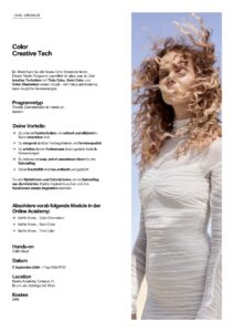 - Du erlernst Farbtechniken, die schnell und effizient im Salon einsetzbar sind