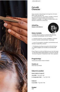 Dieses intensive Cutting-Programm bringt deine Schneide-Skills auf das nächste Level. Du meisterst klassische und moderne Techniken, verfeinerst Präzision und Freehand-Arbeit und lernst, Formen individuell zu gestalten – für tragbare, trendbewusste Looks mit klarer Handschrift im Salonalltag. Dieses Programm stärkt dein Selbstvertrauen beim Schneiden und hebt deine Beratungskompetenz auf ein neues Level. Ein intensives Programm für Stylist:innen aller Erfahrungsstufen.