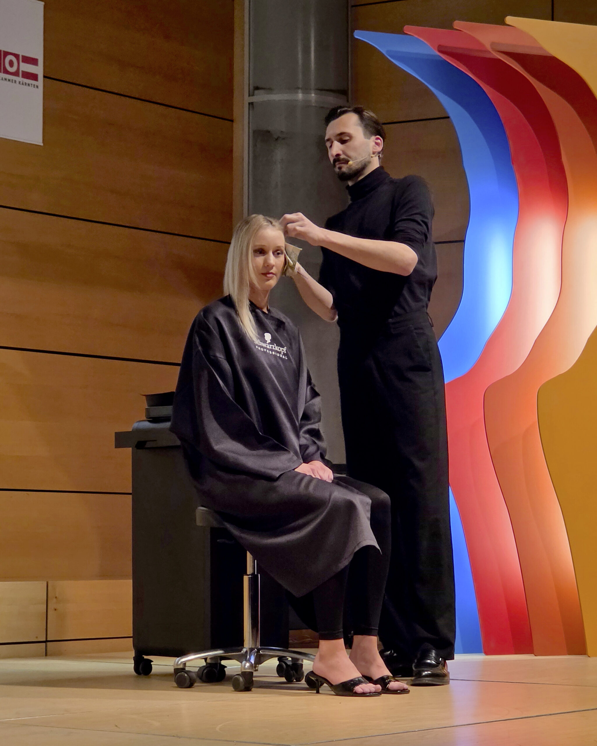 Karin Wagner begrüßte die über 110 Gäste herzlich, bedankte sich für die wertschätzende Zusammenarbeit und betonte, wie wichtig es ist, gemeinsam neue Ideen und zukunftsweisende Impulse für den Friseurberuf zu entwickeln. Ein besonderer Dank galt den Ehrengästen, allen Stylist:innen Kärntens sowie dem engagierten Team von Schwarzkopf Professional, vertreten durch Birgit Scheuch, Goran Nikic, Matthias Gruber, Bernadette Gudera, Heide-Marie Koschuch, Oliver Kössler, Corinna Egger, Florian Auzinger und Cat / #itsthebarbercat.