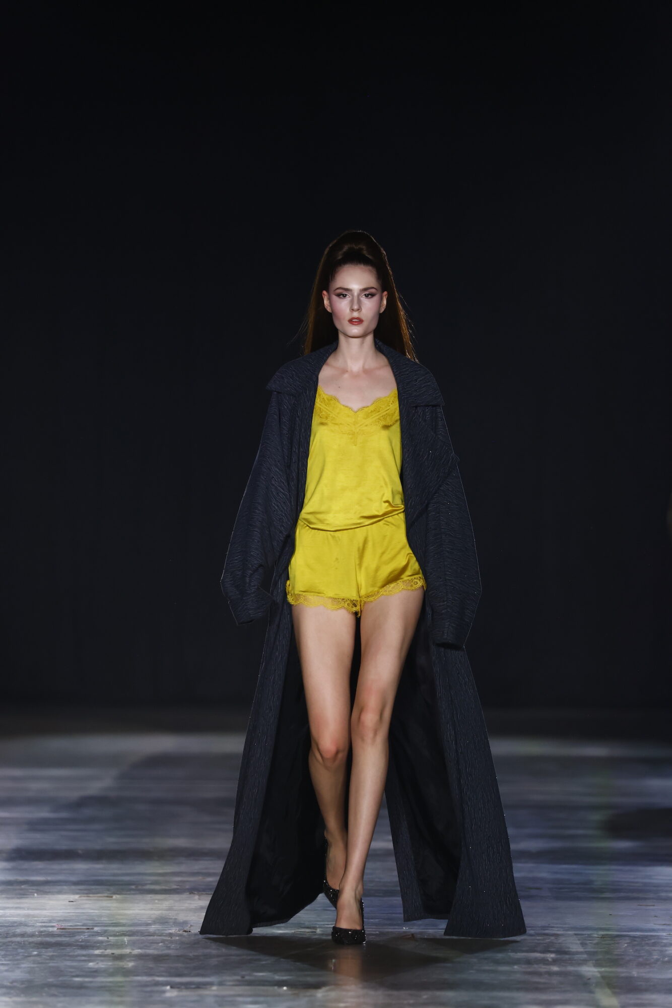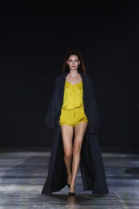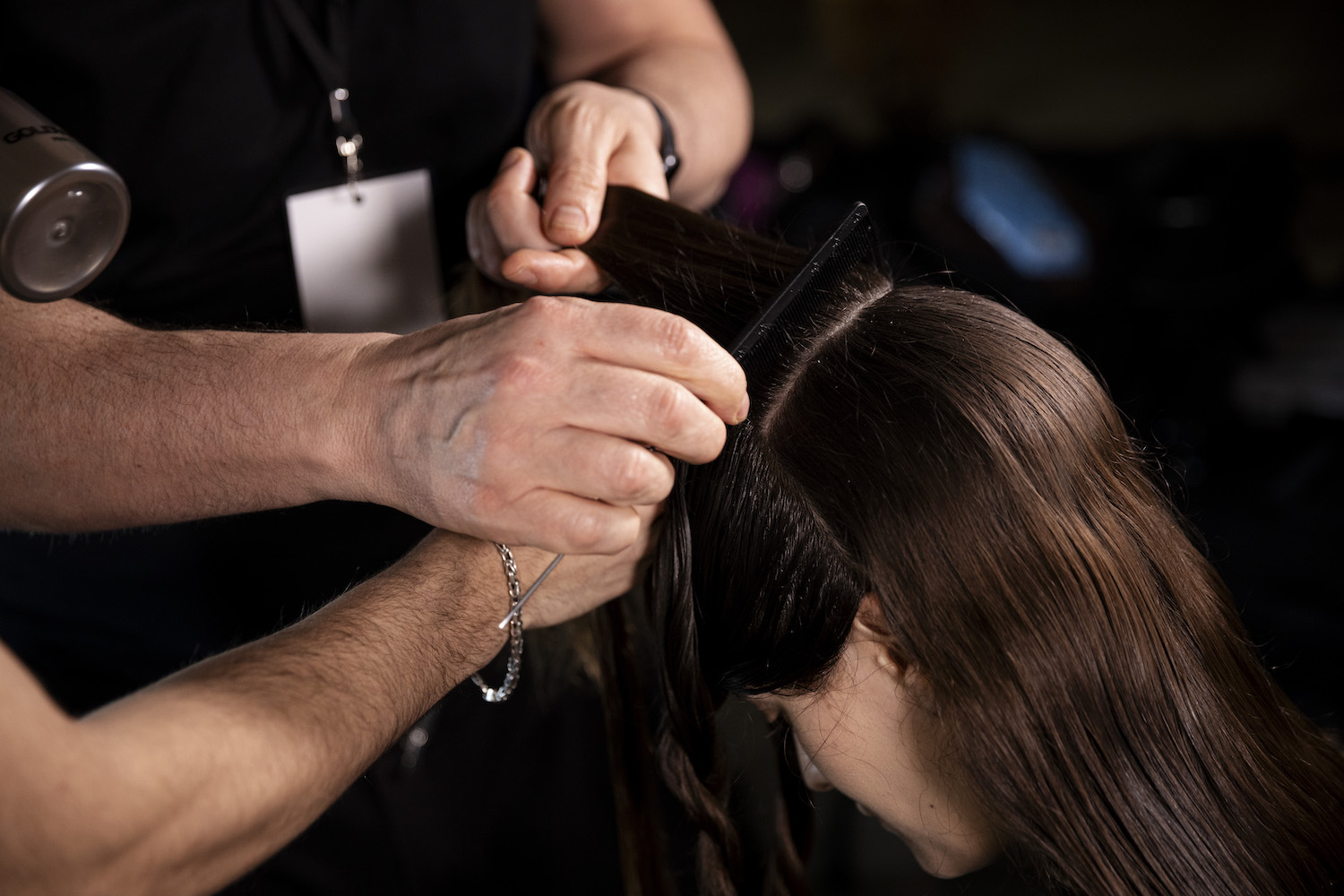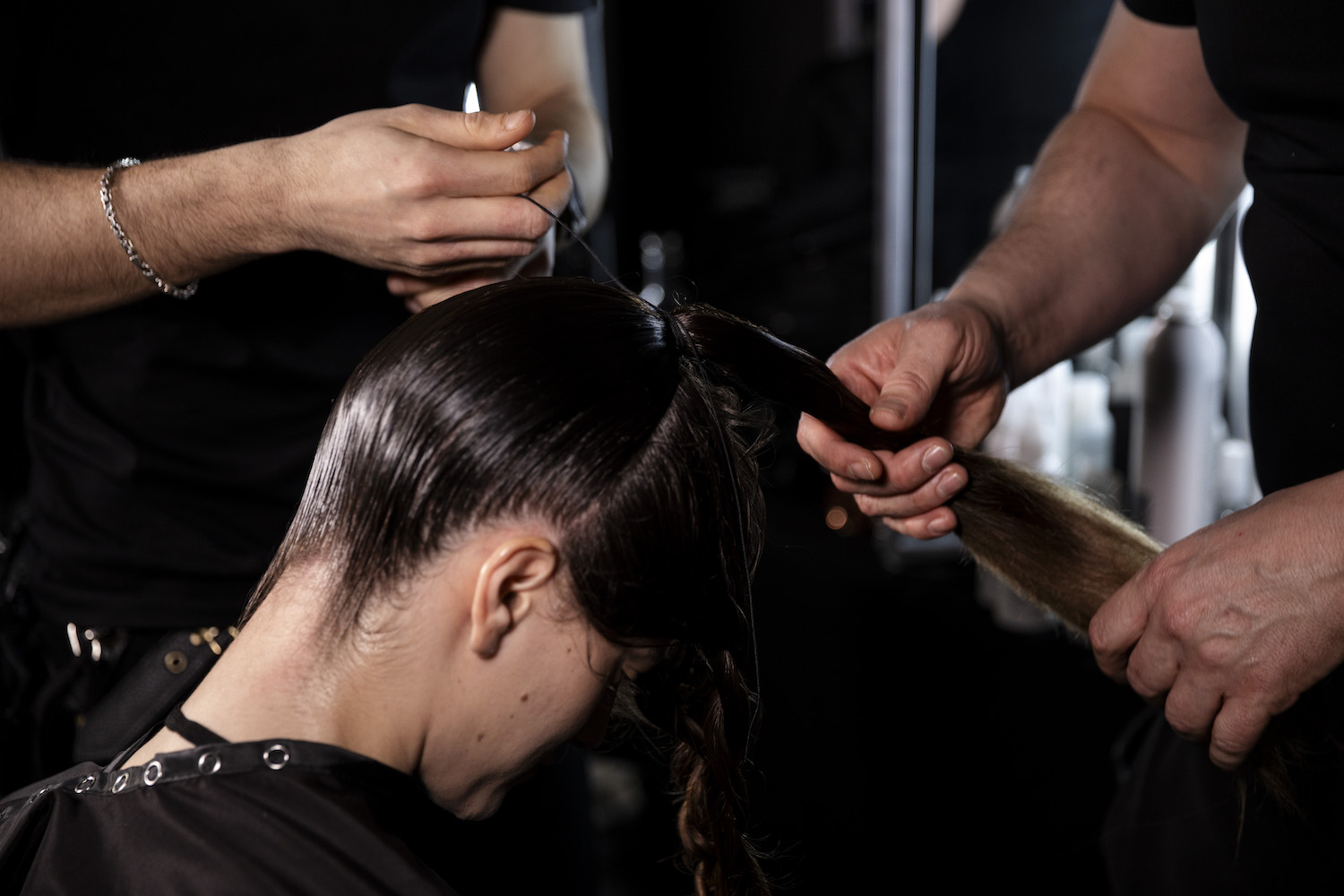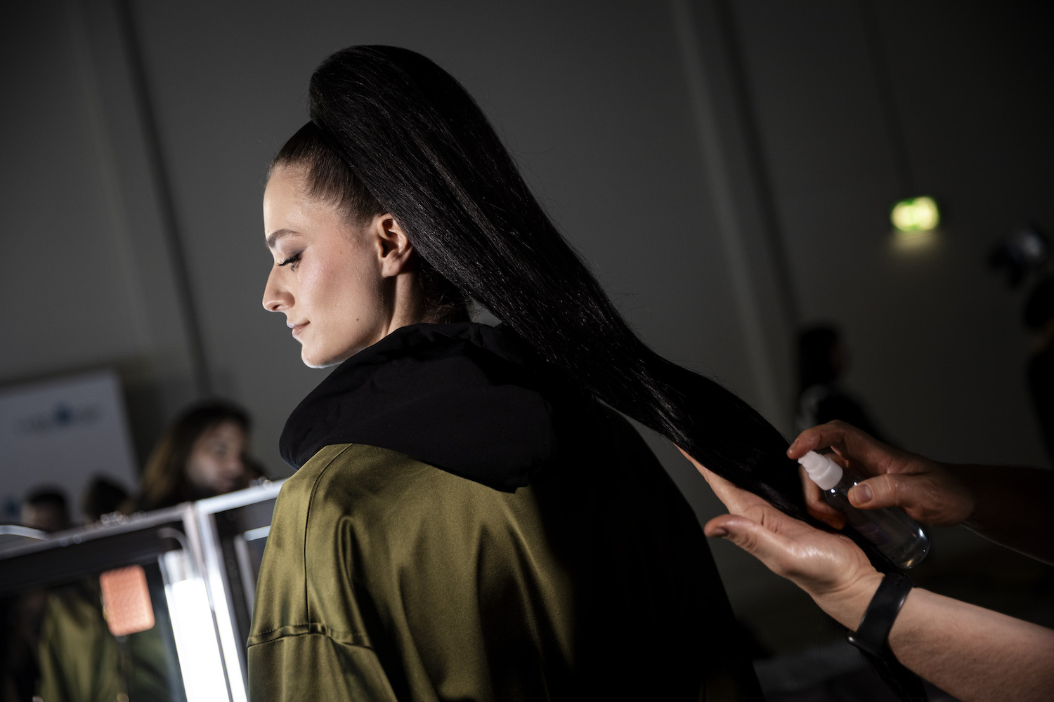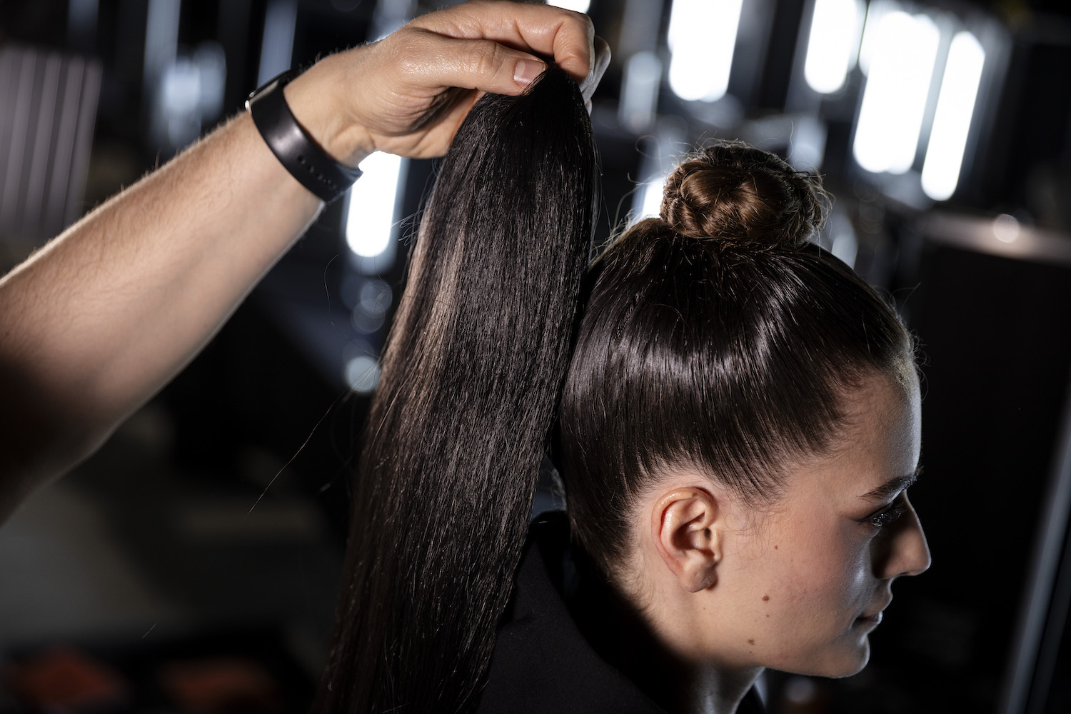 Für Kilians Kerners „Gangstaaa“-Show setzte das Goldwell Team auf markante 90s‑Referenzen mit modernem Finish. Bei den Frauen dominierten streng nach hinten gekämmte Oberköpfe, kombiniert mit extralangen, hoch angesetzten Ponytails aus Kunsthaar. Der Look erhielt durch das StyleSign Weightless Shine-Oil einen intensiven, fast flüssigen Glanz, der die luxuriöse Attitüde der Kollektion unterstrich.