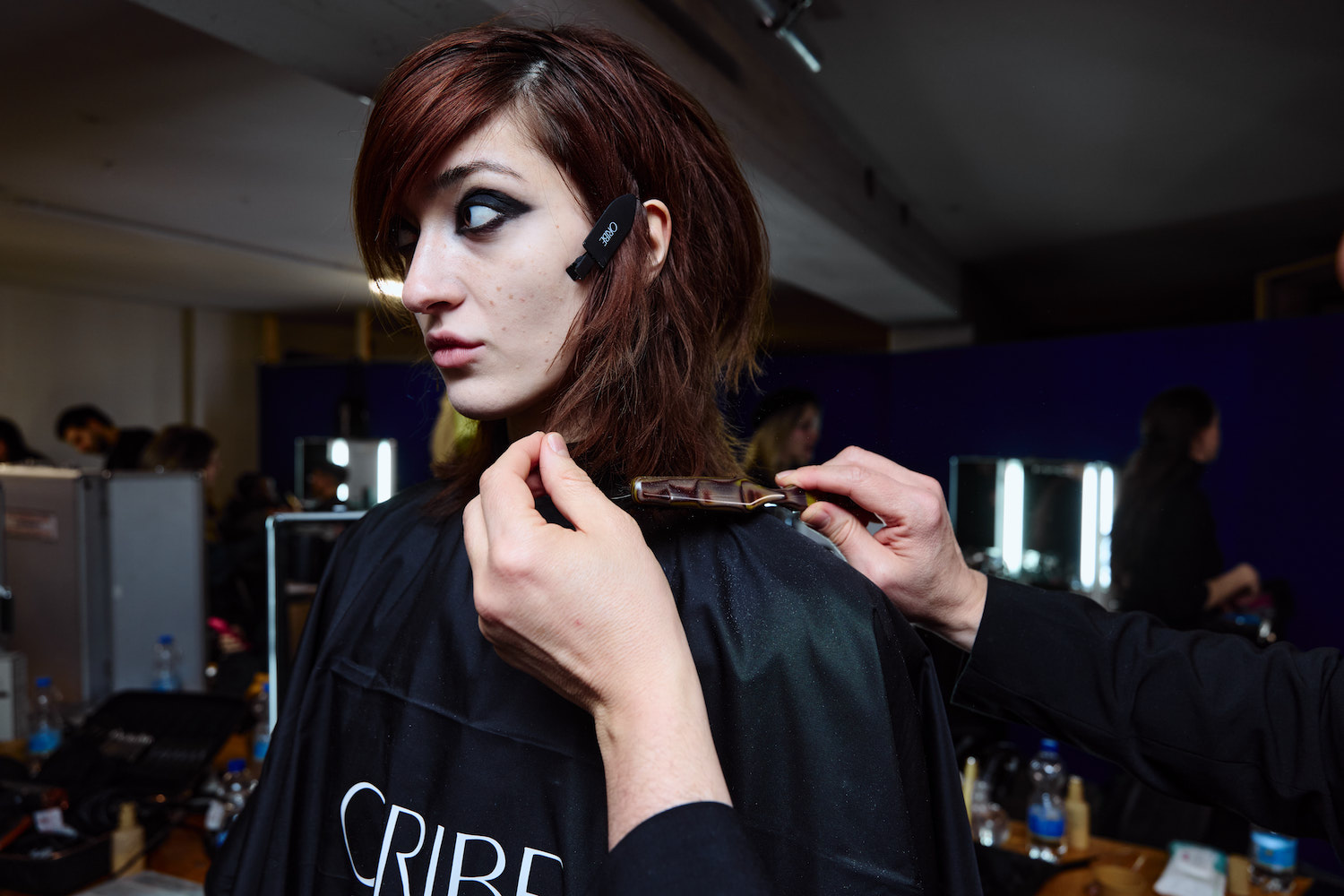 Inspiration war der Post-Millennial-Look aus dem Jahr 2010: ein tiefer Seitenscheitel mit üppigem seitlichem Pony. Für die weiblichen Models wurden matte, wellige Texturen umgesetzt.